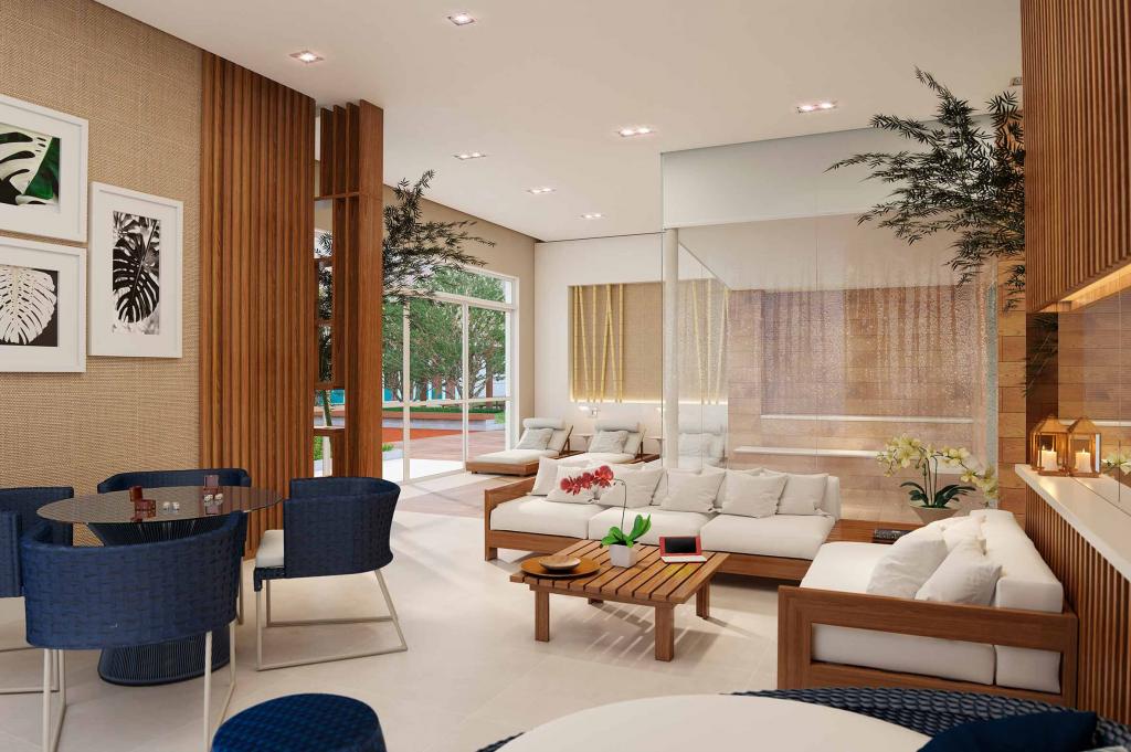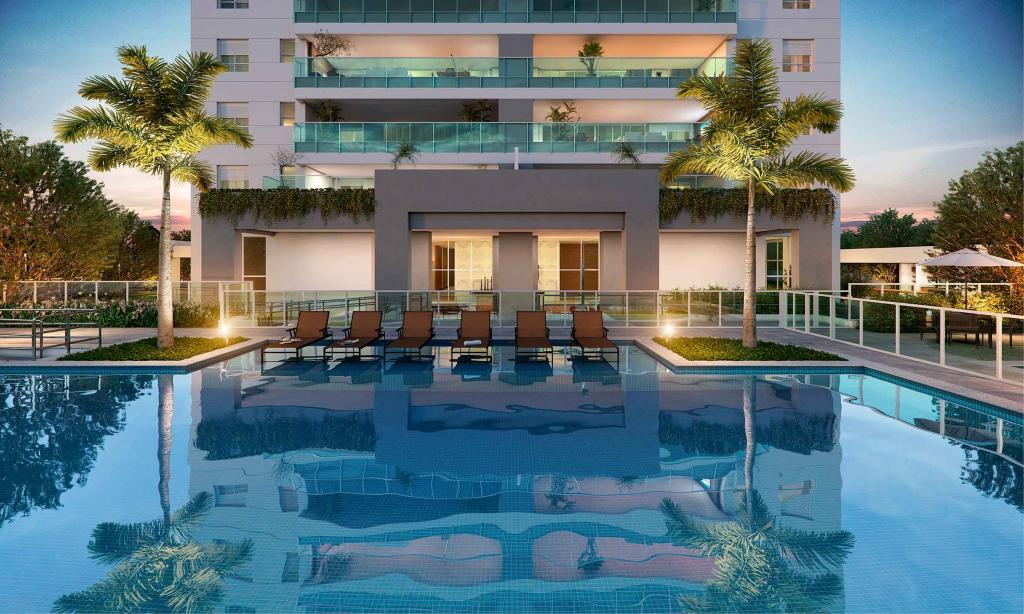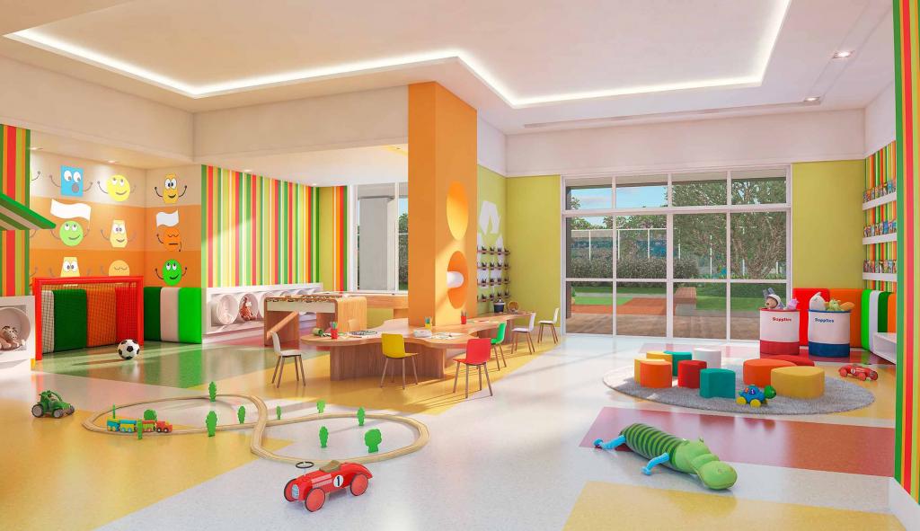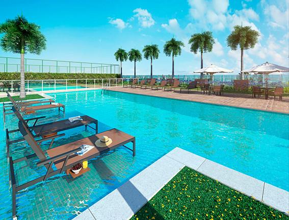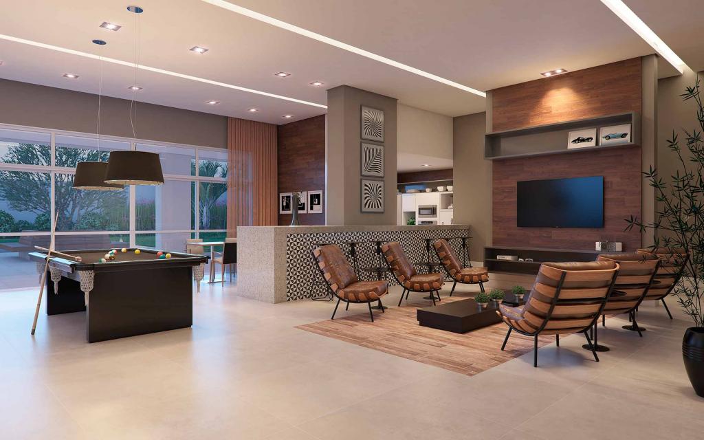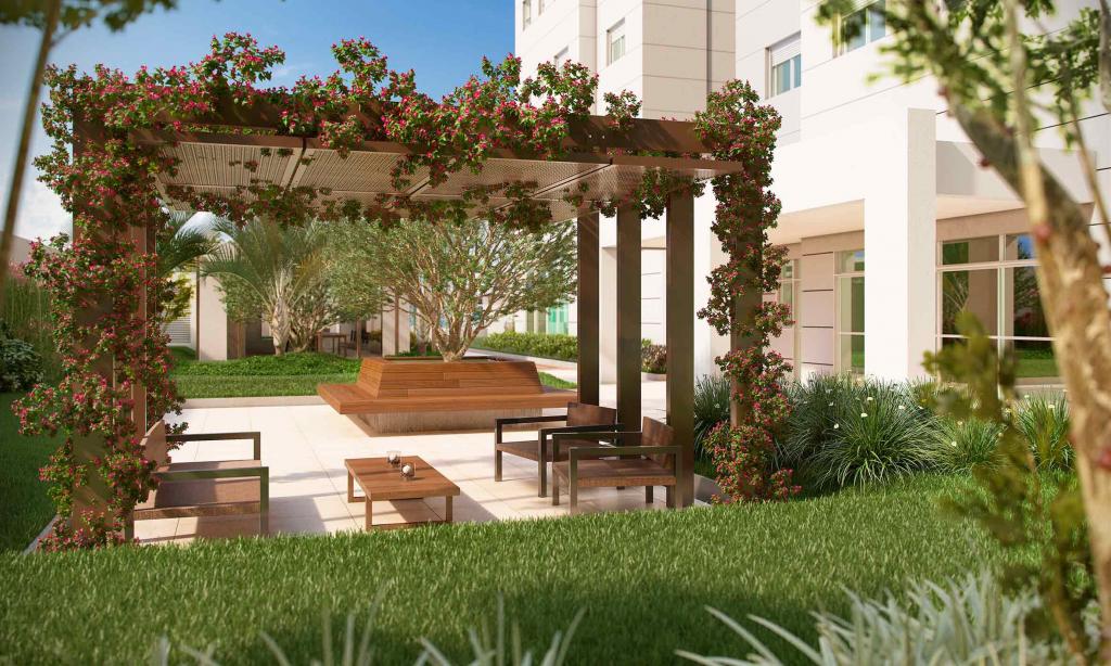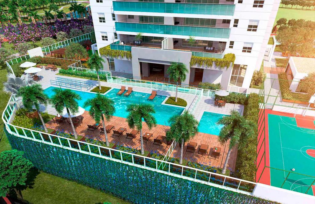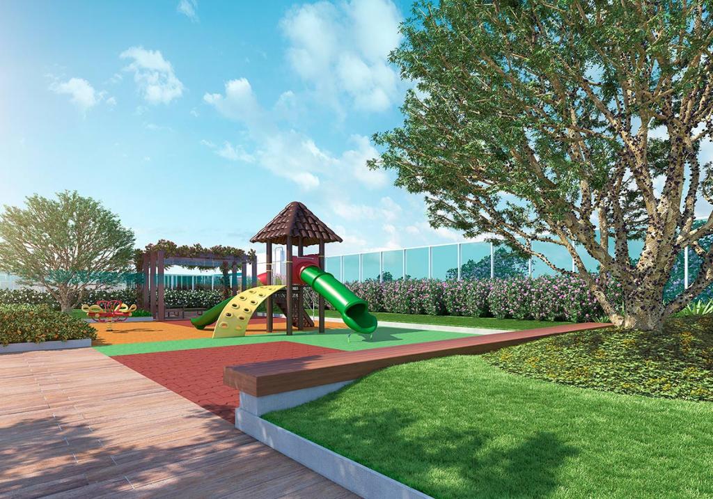 Condomínio oferece área de lazer completa, com piscina, playground, etc.