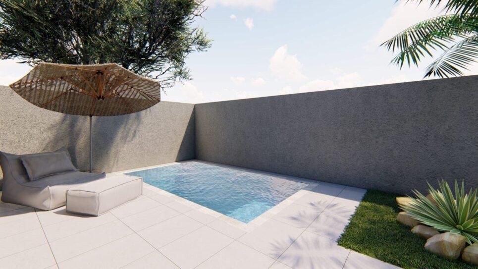 Piscina com cascata, iluminação e preparação para aquecimento.